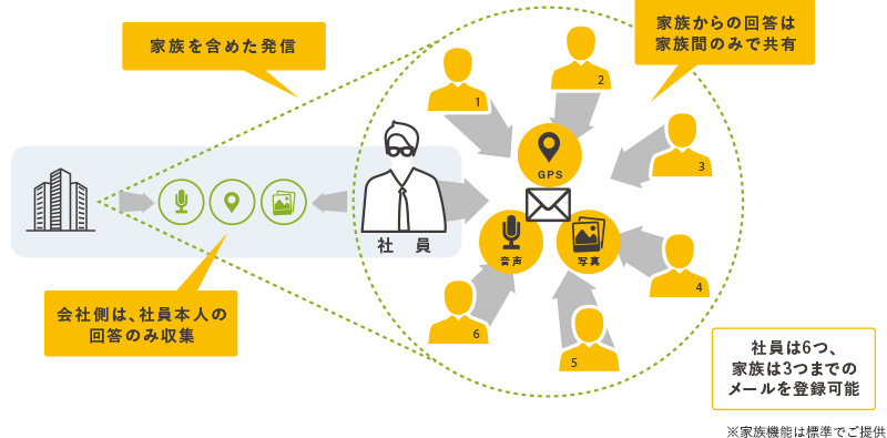 Safetylink24は、企業・学校等向けのシステムでありながら、ユーザー1人に対して6人までの家族登録が可能です。家族用コメント欄を使えば、家族間だけで安否状況のやり取りが可能です。