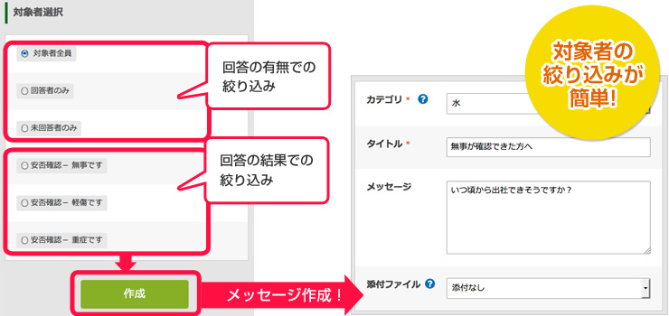 送信済メッセージの回答結果から対象者を絞って新規メッセージを作成でき、BCPの行動規定に沿った必要な指示を迅速に行うことが可能です。