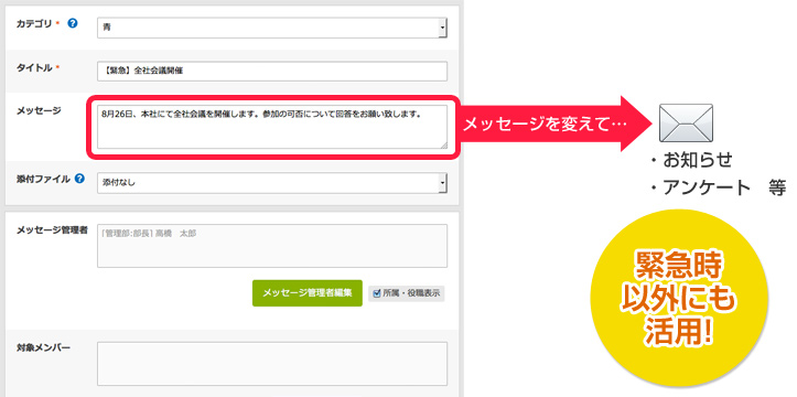 災害発生時の安否確認だけでなく、平常時の連絡手段として、社内やグループ間での一斉連絡、キャンペーン案内やアンケート調査などの販促ツールとしてもご利用いただくことが可能です。もちろんご利用料金はかわりません。