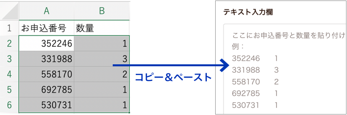 テキスト入力欄(ここにお申込番号と数量を貼り付けます)
